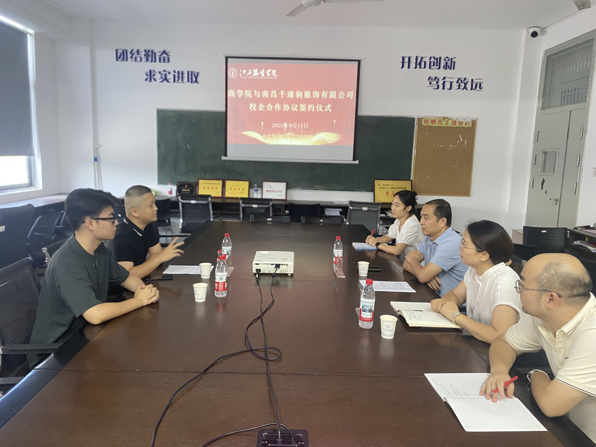 为进一步做好毕业生就业服务工作,持续深入推进校企合作工作,培养符合行业需求和社会发展需要的高素质应用人才,9月17日,南昌千臻驹服饰有限公司经理郑臻等人来校展开了校企深度合作的签约仪式,并就相关专业在产教融合、专业实习、双师型师资培养、科学研究、人才培养、学生就业等领域合作事宜进行深入交流,新葡的京集团35222vip党总支书记黄晶磊、副院长罗芳、教师代表涂建等出席会议,会议由黄晶磊书记主持。